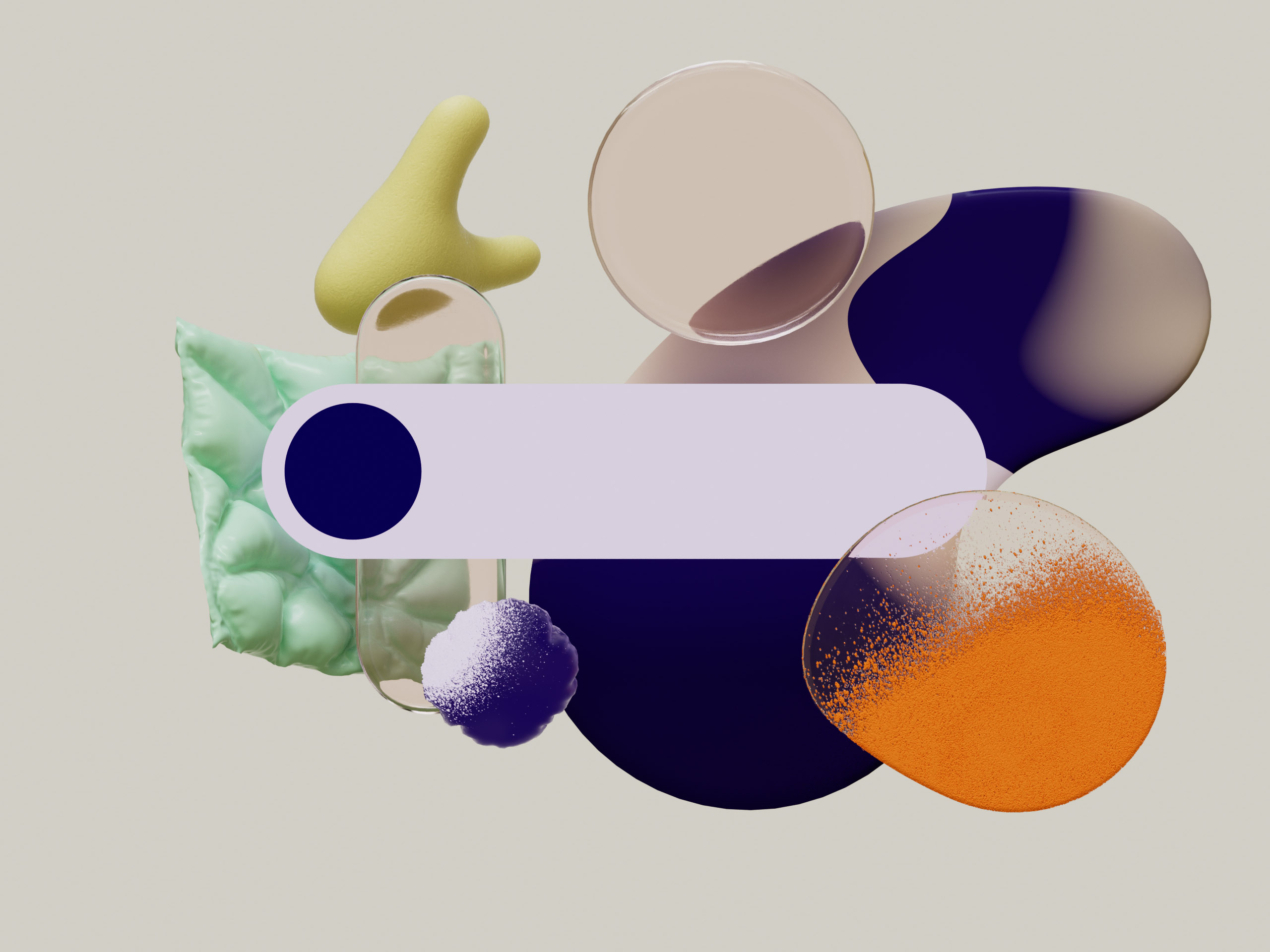 Playful arrangements of abstract objects create compositions that are floaty with little to no spatial context. The materiality is abstract, but the light semi-realistic with shadowing between the objects.